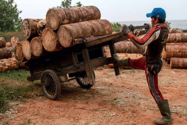 Di sebuah lahan gambut kering, seorang pria tampak terseok-seok membawa tumpukan batang pohon sagu yang terikat dengan tali bekas ban dalam diatas gerobak. Gerobak ditarik menggunakan kendaraan bermotor roda dua. Dibawah terik matahari yang menyengat, ia berjalan pelan untuk menjaga keseimbangan agar batang sagu yang dia bawa tidak berhamburan ke tanah.