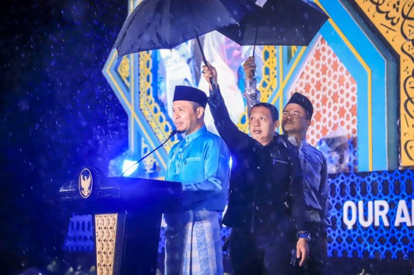 “Mungkin payungnya diawaskan saja. Saya ingin merasakan guyuran hujan bersama masyarakat. Meski hujan, suasananya luar biasa hangat karena kita menyaksikan suksesnya pembukaan MTQ tahun ini,” ucapnya sambil menepis tangan ajudannya di tengah guyuran hujan.