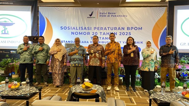 RIAU24.COM - Gabungan Pengusaha (GP) Farmasi Provinsi Riau dan Himpunan Seminat Farmasi Distribusi (HISFARDIS) Ikatan Apoteker Indonesia (IAI) Riau berkolaborasi dengan BBPOM di Pekanbaru dalam melaksanakan sosialisasi Peraturan BPOM No. 20 Tahun 2025 tentang Standar Cara Distribusi Obat yang Baik (CDOB) kepada pelaku usaha farmasi di Ballroom Grand Jatra Hotel, pada Jumat (12/12/2025).